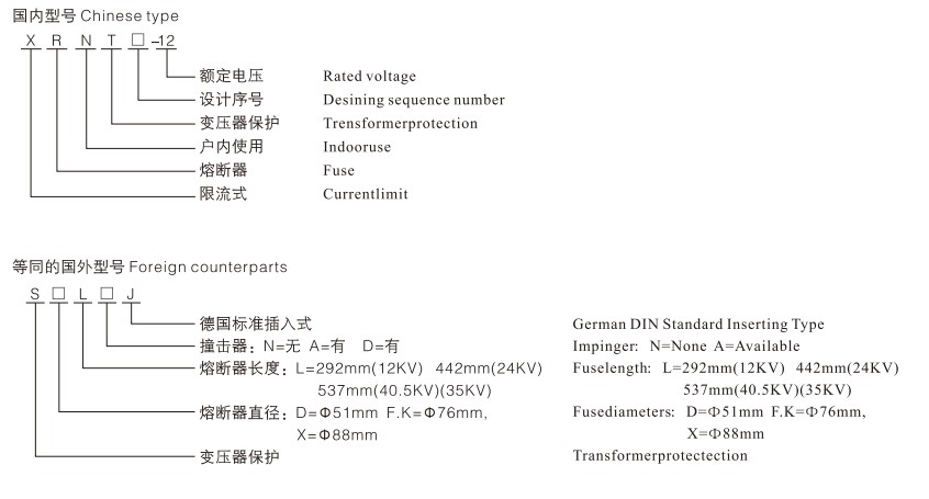مدل ولتاژ نامی Un(kV) جریان نامی ذوب In(A) اندازه لوله ذوب ①xC(mm) اظهارات