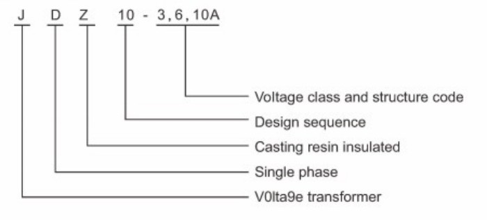 J = ترانسفورماتور ولتاژ، D = تک فاز، Z = عایق ریختگی رزین اپوکسی، 3/6/10 = سطح ولتاژ.